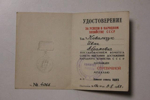 Серебряная медаль за успехи в народном хозяйстве СССР прилагается удостоверение на имя награждаемого в 1963 году.