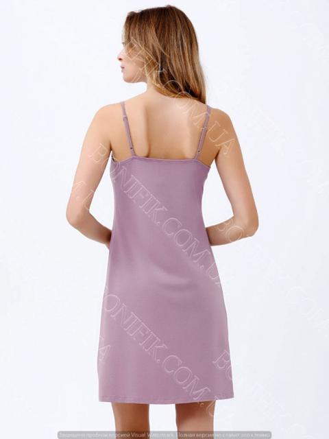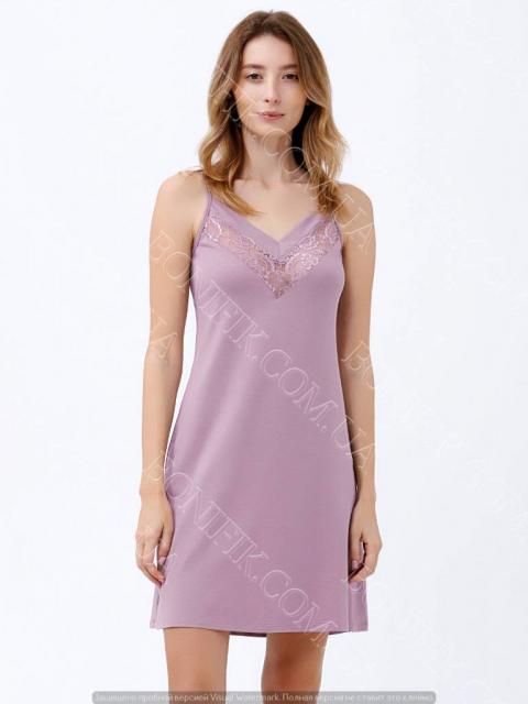 Модель ночнушки на тонкой бретели, зона декольте декорирована кружевной вставкой.