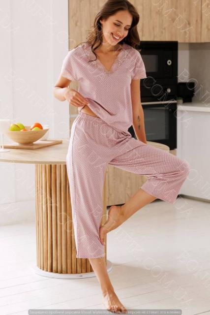 Верх пижамы выполнен с аккуратным V-образным вырезом, дополненным деликатными кружевными вставками, которые придают образу нежность и элегантность.