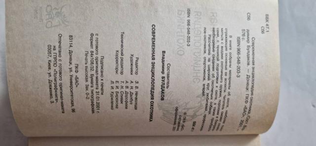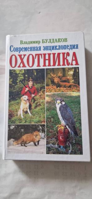 Сучасна енциклопедія мисливця. Автор-упорядник: Володимир Булдаков Виробництво «БАО», Донецьк, 2000р. Формат 84х108/32, мова російська, 576 стор. з ілюстраціями, палітурка тверда, стан хороший. У книзі зібрані матеріали про полювання, які найбільш повно відображають основні її аспекти. Читач зможе познайомитися з видами мисливської зброї, порохами та боєприпасами, з технікою підготовки до полювання, а також отримати необхідні відомості про мисливських собак.